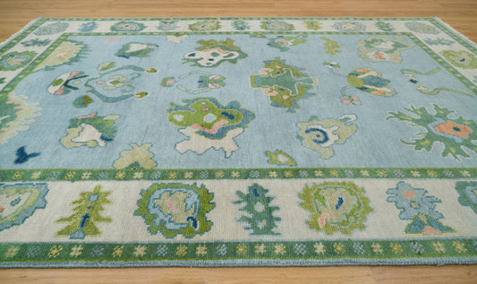 Blue Green Handknotted Oushak Rug | Turkish Wool Oriental Carpet | Vintage Style Soft Pastel Area Rug for Living Room & Bedroom