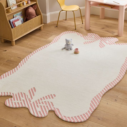 Whimsical Bow Hand-Tufted Rug | Pink & White Striped Border Accent Carpet | Playful Modern Area Rug for Nursery, Kids Room & Living Space