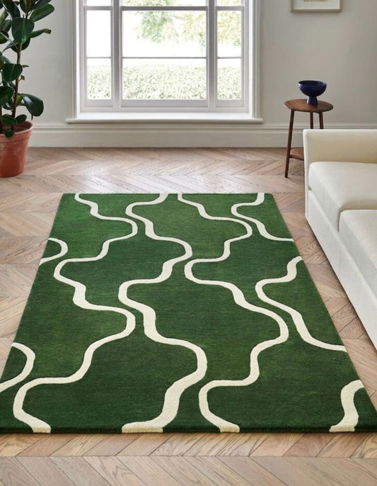 Wavy Green and Cream Modern Area Rug – Hand-Tufted Abstract Carpet for Living Room, Bedroom & Home Decor