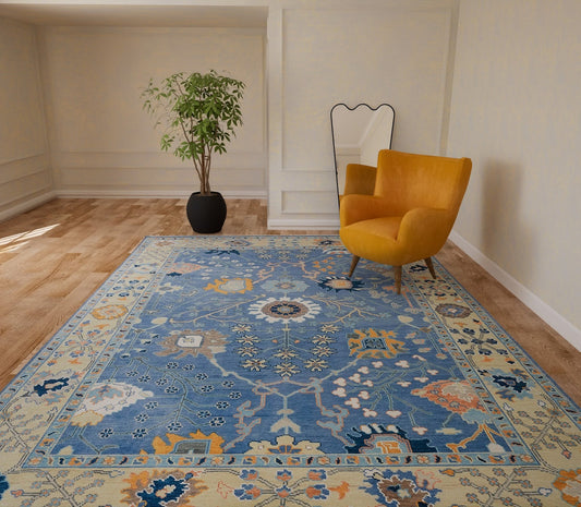 Hand-Knotted Blue Oushak Rug – Authentic Turkish Wool Area Carpet