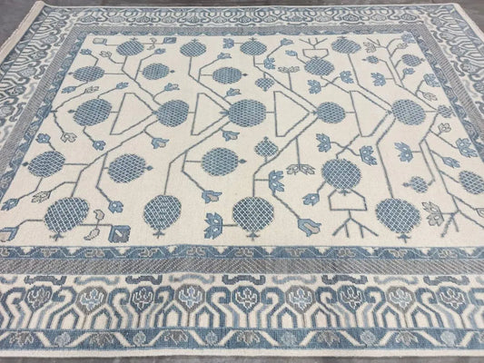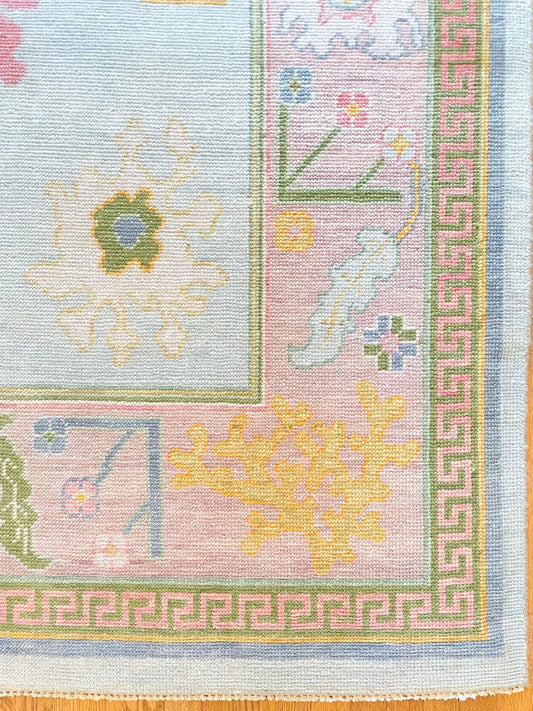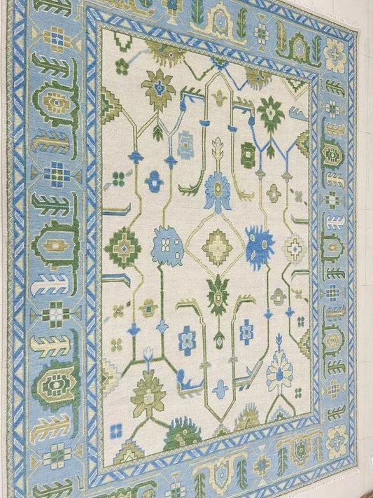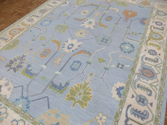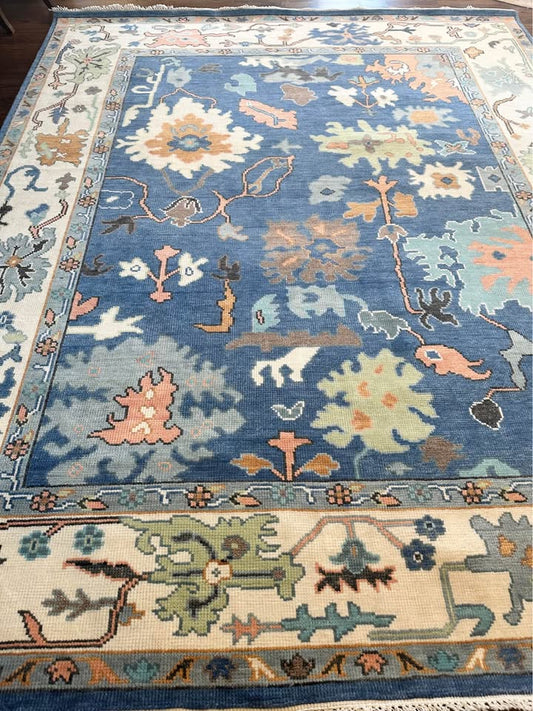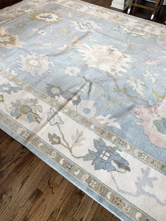 Hand Knotted Oushak Rug | Blue Turkish Floral Carpet | Vintage Style Wool Area Rug | Soft Pastel Botanical Design | Living Room Decor | Handmade Luxury Rug