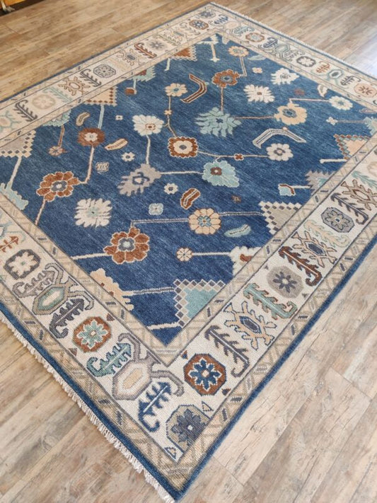 Blue Handknotted Oushak Rug – Traditional Turkish Wool Area Carpet with Floral & Geometric Motifs, Oriental Bohemian Living Room Decor