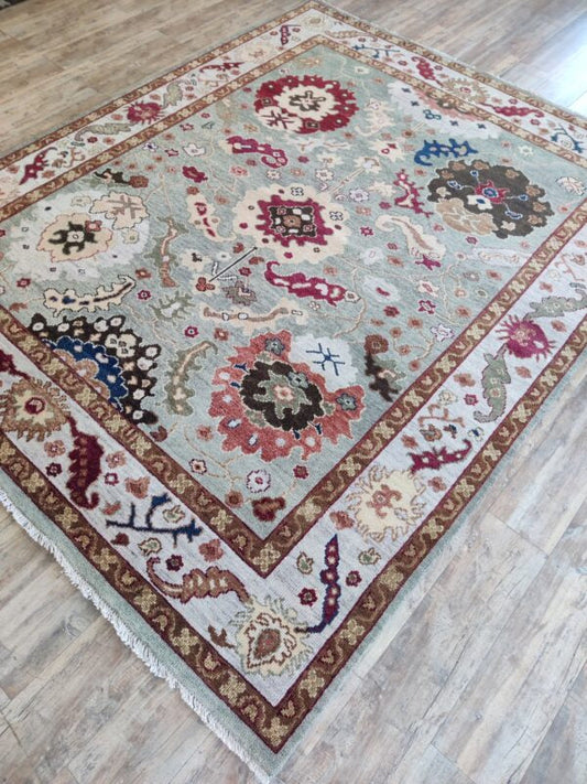Light Blue Handknotted Oushak Rug – Traditional Turkish Wool Carpet with Red & Ivory Floral Motifs, Oriental Vintage Area Rug for Living Room Decor