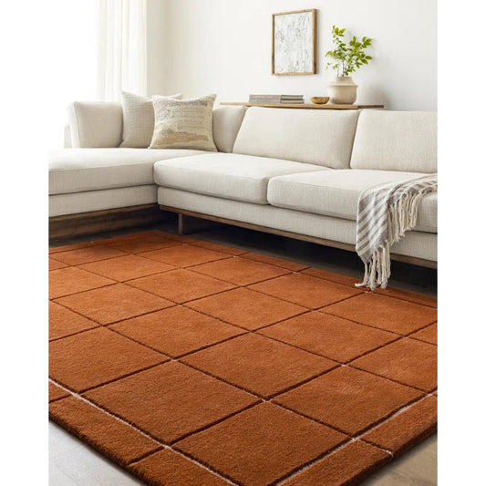 Artisan Hand-Tufted Terracotta Wool Rug | Grid and Border Design for a Warm, Modern Feel