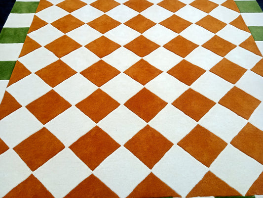 Checkered Area Rug with Green Border – Modern Hand-Tufted Carpet in Orange & White Diamond Pattern for Living Room, Dining Room & Contemporary Home Décor