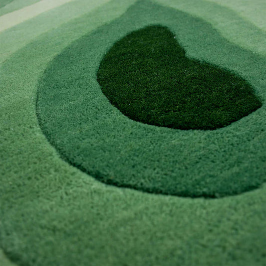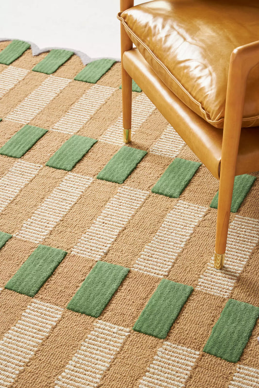 Green and Beige Checkerboard Scalloped Rug – Handmade Tufted Carpet for Modern Boho Living Room, Nursery or Entryway
