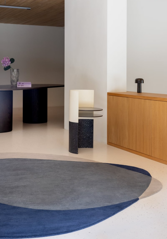 Contemporary Organic Shape Area Rug – Overlapping Navy, Gray & Beige Abstract Design for Modern Living Room & Bedroom Décor