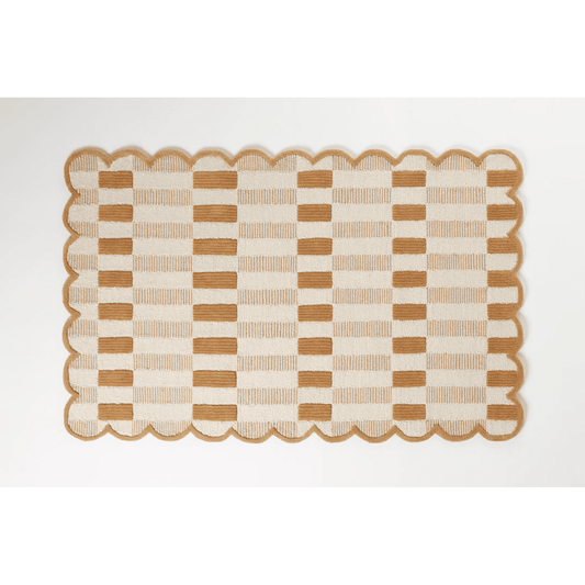 Neutral Checkerboard Scalloped Edge Rug – Beige and Brown Handmade Tufted Carpet for Minimalist or Boho Home Decor