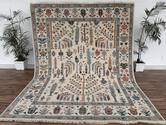 Hand-Knotted Oushak Rug: Exquisite Tree of Life Design on Cream Background - Authentic Indian Craftsmanship