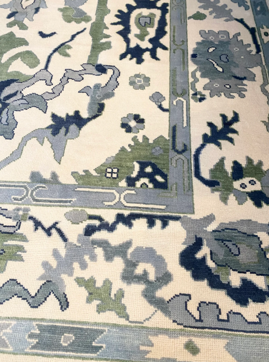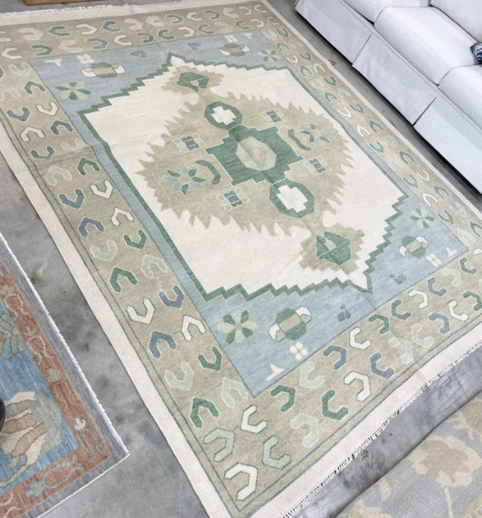 Hand Knotted Oushak Rug – Soft Pastel Blue & Green Turkish Style Area Carpet | Traditional Wool Oriental Rug