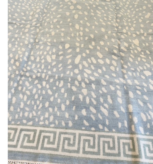 Hand Knotted Oushak Rug – Blue Modern Antelope Pattern with Greek Key Border | Luxury Wool Area Carpet