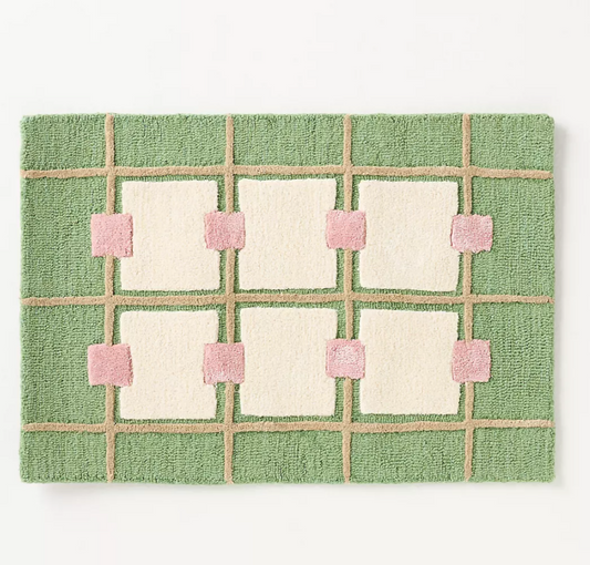 Modern Geometric Bath Mat – Soft Cotton Rug with Pink & Green Checkerboard Design, Non-Slip & Absorbent – Aesthetic Bathroom Decor