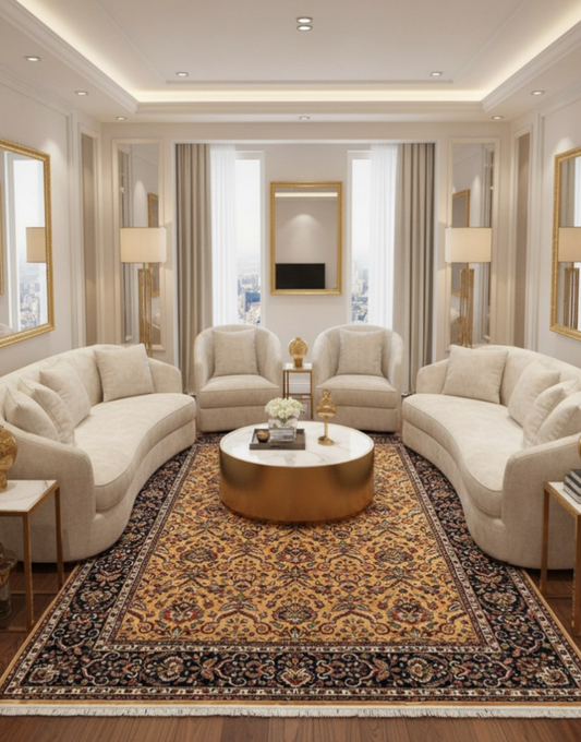 Luxury Persian Silk Area Rug – Golden Sand Floral Palace Design with Navy Border, Soft Shiny Finish, Premium Elegant Carpet for Living Room & Bedroom
