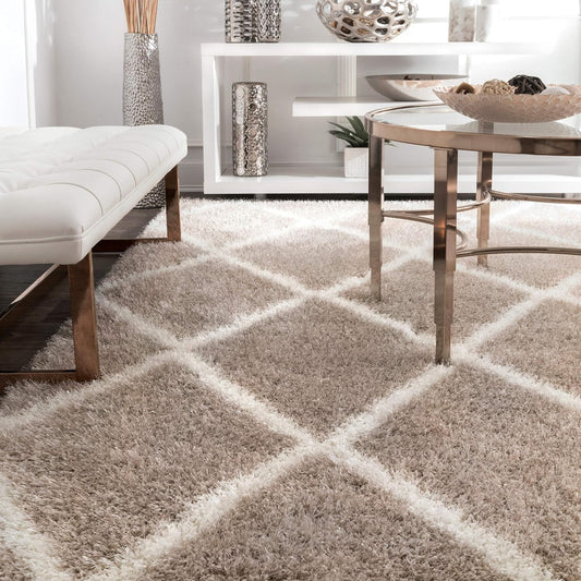 Handcrafted Super Soft Microfiber Shaggy Beige Ivory Trellis Carpet